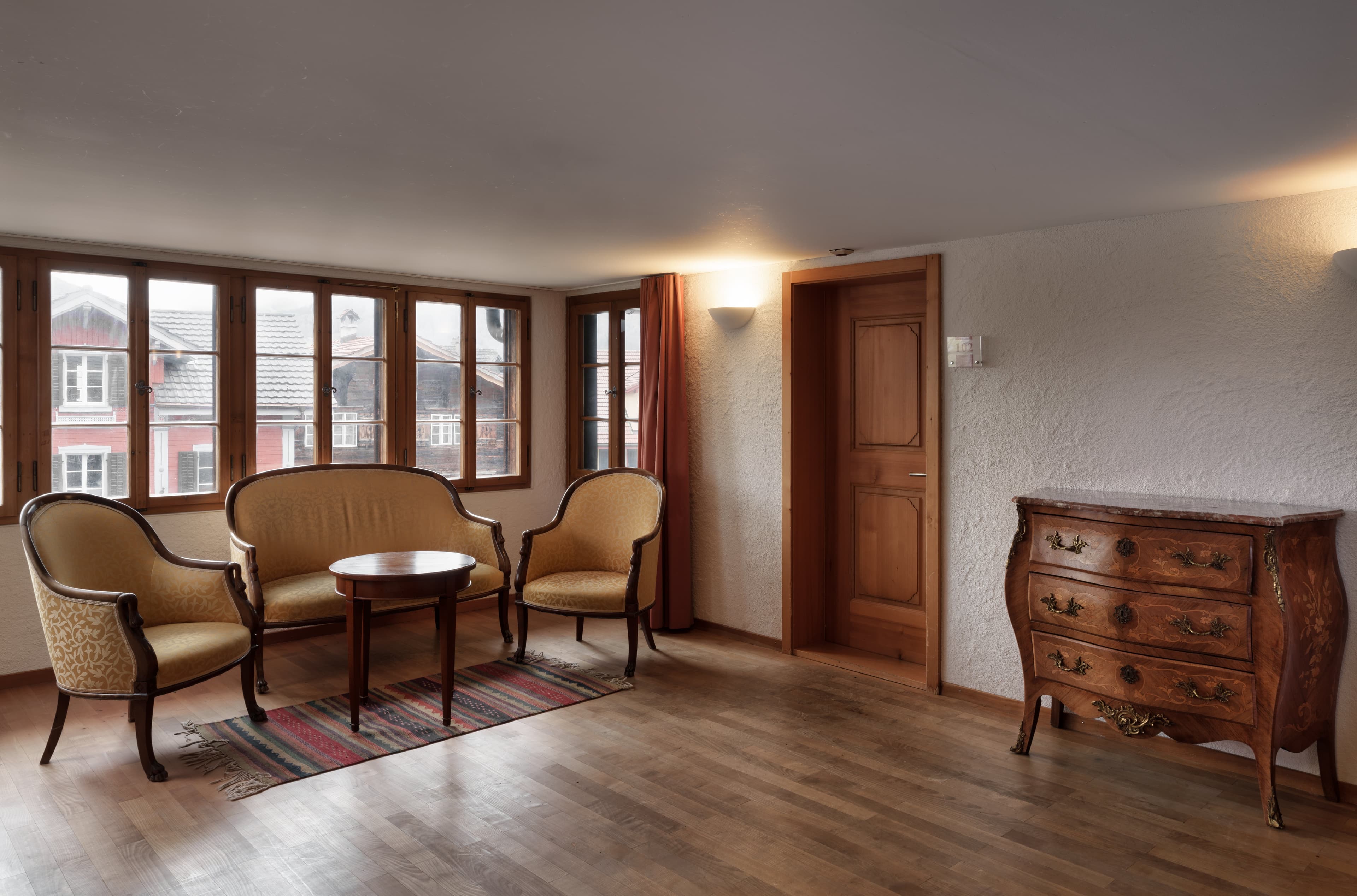 Zusätzlich zu den frisch renovierten Zimmern im Haupthaus stehen während der Hauptsaison weitere Zimmer im Farbhaus zur Verfügung. Dieses geschichtsträchtige Gebäude, eines der ältesten Holzhäuser der Schweiz, steht unter Heimatschutz. Das Ambiente und die Zimmer bestechen durch einen authentischen Chalet-Charme.